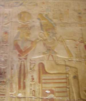 Isis was the first daughter of Geb, the earth god and Nut the sky goddess, and she was the sister and wife of Osiris. Her Egyptian name was Auset, thought to mean “throne”. In the murals Isis is often portrayed wearing a vulture-shaped headdress with two horns cradling a solar disk, revealing her association with Ma’at and Hathor.